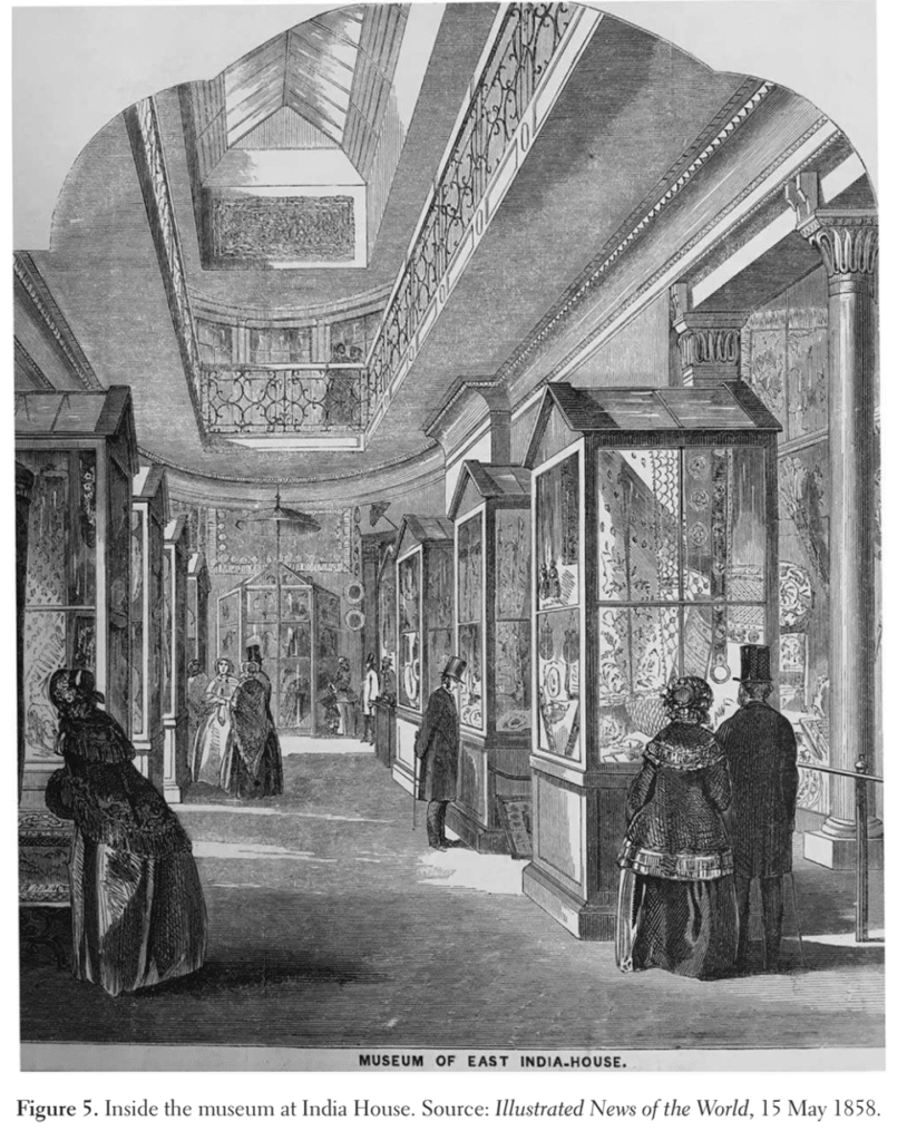 ইস্ট ইন্ডিয়া কোম্পানির জাদুঘর, গ্রন্থাগারের যাত্রা শুরু হয় ১৮০১-তে। কোম্পানির চরিত্রের মতোই এই জাদুঘর-গ্রন্থাগার কিন্তু কর্পোরেট আর রাষ্ট্রের মিলিজুলি সরকারি-বেসরকারি সম্পত্তি হিসেবে গণ্য হয়েছে, পরিচালিতও হয়েছে। অর্থ এসেছে ভারতে আদায় করা রাজস্ব উদ্বৃত্ত থেকে। কোম্পানির এই জাদুঘর-গ্রন্থাগার এমন এক সরকারের সম্পত্তি ছিল, যে সরকার চালাত শেয়ারহোল্ডাররা। জাদুঘর কোম্পানির নামে পরিচালিত হলেও, জনগণ একে ব্রিটেনের অন্যতম প্রধান পাবলিক জাদুঘর মানত। আনুষ্ঠানিক নাম অনারেবল ইস্ট ইন্ডিয়া কোম্পানি মিউজিয়াম, জনলব্জে ইন্ডিয়া মিউজিয়াম। আঠের শতের মাঝামাঝি এই জাদুঘর-গ্রন্থাগার সমগ্র ইউরোপিয় গবেষকের কাছে এশিয়ার বিস্তৃততম তথ্য সংগ্রহের আকর হয়ে ওঠে। ব্রিটিশ মিউজিয়ামের মতো, কোম্পানির মিউজিয়ামও লন্ডনে ঘুরতে আসা ভ্রমণ পিয়াসীদের অন্যতম গন্তব্য হয়ে উঠবে। এর প্রদর্শন বিশ্বজোড়া প্রদর্শনীতে অংশ নিয়েছে। তবে এগুলো ব্যবহার করা হয়েছে জ্ঞান উৎপাদনের উপকরণ হিসেবে। ১৮৫৮-তে ইস্ট ইন্ডিয়া কোম্পানি উঠে গেলে এবং কোম্পানির শাসন অঞ্চল সরাসরি ক্রাউন শাসনের অধীনে এলে, জাদুঘরের বিপুল সংগ্রহ হোয়াইটহলে চলে যায়। ১৮৭০-এর দশকের শেষের দিকে পুনর্গঠিত ইন্ডিয়া মিউজিয়ামকে ভেঙে ছড়িয়ে দেওয়া হবে ব্রিটিশ মিউজিয়াম, কিউ গার্ডেন, সাউথ কেনসিংটনের নতুন জাতীয় জাদুঘর কমপ্লেক্সে।